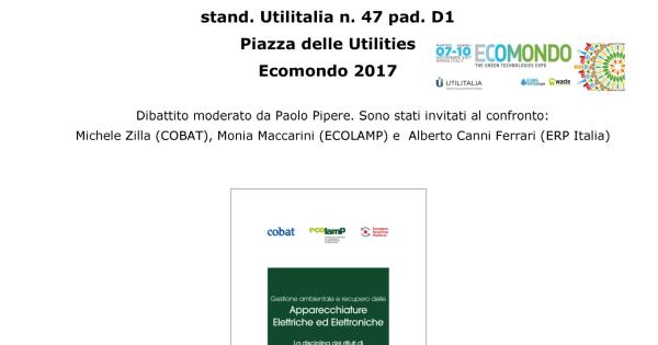 Si terrà giovedì 9 novembre 2017, dalle ore 15:00 alle ore 16:00, presso il Fiera di Rimini (Ecomondo 2017) stand UTILITALIA (PAD D1 stand 047), la presentazione del libro “Gestione ambientale e recupero delle Apparecchiature Elettriche ed Elettroniche”, di Paolo Pipere, edizione realizzata grazie al contributo di COBAT, ECOLAMP ed European Recycling Platform.